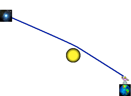 In this way, General relativity predicts that space-time around our sun is warped, and therefore the light coming from a background star should be deflected around the sun on its way to earth. The effect of the sun's warped space-time then should shift the apparent position of the star from its true location from our perspective on earth.