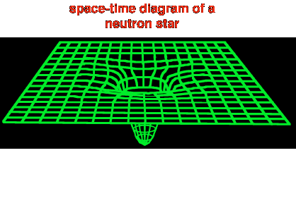 This is a space-time diagram of a neutron star. The depth of the distortion suggests that you would need a very large speed to leave the surface of a neutron star. The escape velocity from a typical neutron star is 120,000 miles/s. Could there be anything more extreme than a neutron star? The answer is a surprising, shocking yes. Remember that in the death throes of a massive star, the only thing that stopped gravity from crushing the neutron star even further was the strong force. A star much greater than 8 times the mass of our sun is capable of squeezing the core so hard, that not even the strong force can resist. The strong force is a star's last call to arms. If the strong force is defeated, there is nothing in the universe that can stop gravity, and so the star's core is literally crushed out of existence. This is called a black hole. |
