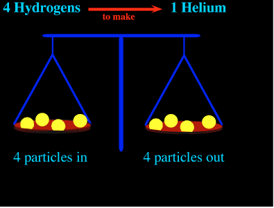 So where does the energy come from? Helium is lighter than 4 hydrogens by 0.7%, and that difference in mass is turned into pure energy according to Einstein's famous equation, E=mc2. So the light that the sun sends us which plants absorb and which we ultimately eat, used to be the mass of the sun itself. |