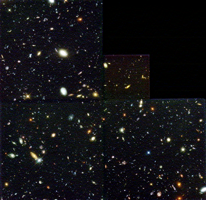 The second question is important because then you know how to interpret the meaning of the colors in the image. Here's a true-color image of some of the farthest galaxies in the universe. Because it's true color, you know that the red galaxies are populated by cool stars and the blue galaxies are populated by hot stars.