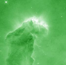 So, to obtain a true color image in astronomy, you have to take three (black & white) exposures, each one with a different color filter. Of course, this means taking three different images of the same object. Here are 3 images of the eagle nebula each taken with a different color filter, blue, green, and red. The computer records only the intensity of each image (black & white), and later colors each b&w image by the color of the filter used (shown on the far right). |