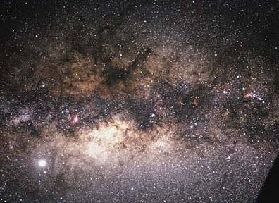 On Earth, our summer night sky points toward the Center of our own Galaxy (GC) shown above in a visible picture with long exposure. When you look in the direction of the constellation Sagittarius this summer, you'll be looking toward the center of the Milky Way. But the plane of our Galaxy is so full of dust and gas that we can't see the center with visible light.
